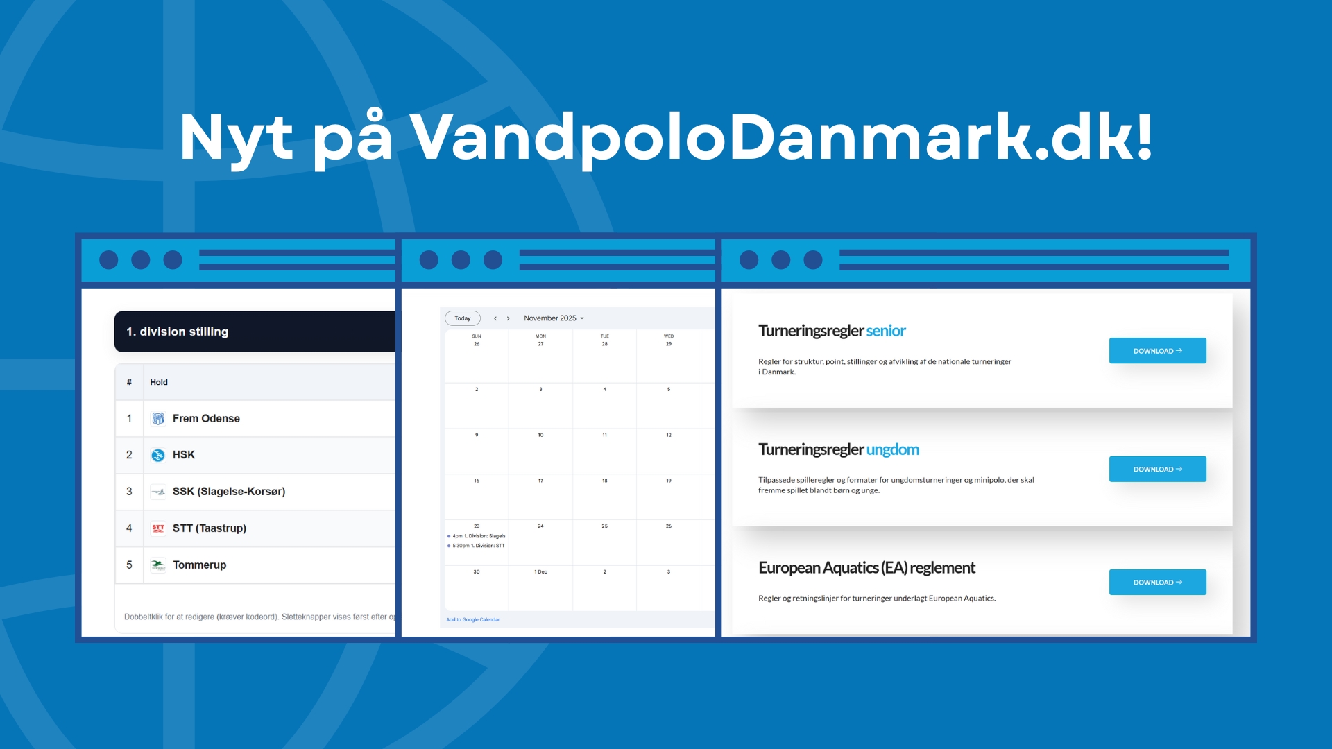 I løbet af efteråret har vi arbejdet målrettet på at opdatere og videreudvikle VandpoloDanmark.dk. Målet er at skabe en mere intuitiv hjemmeside, hvor spillere, klubber og interesserede nemt kan finde