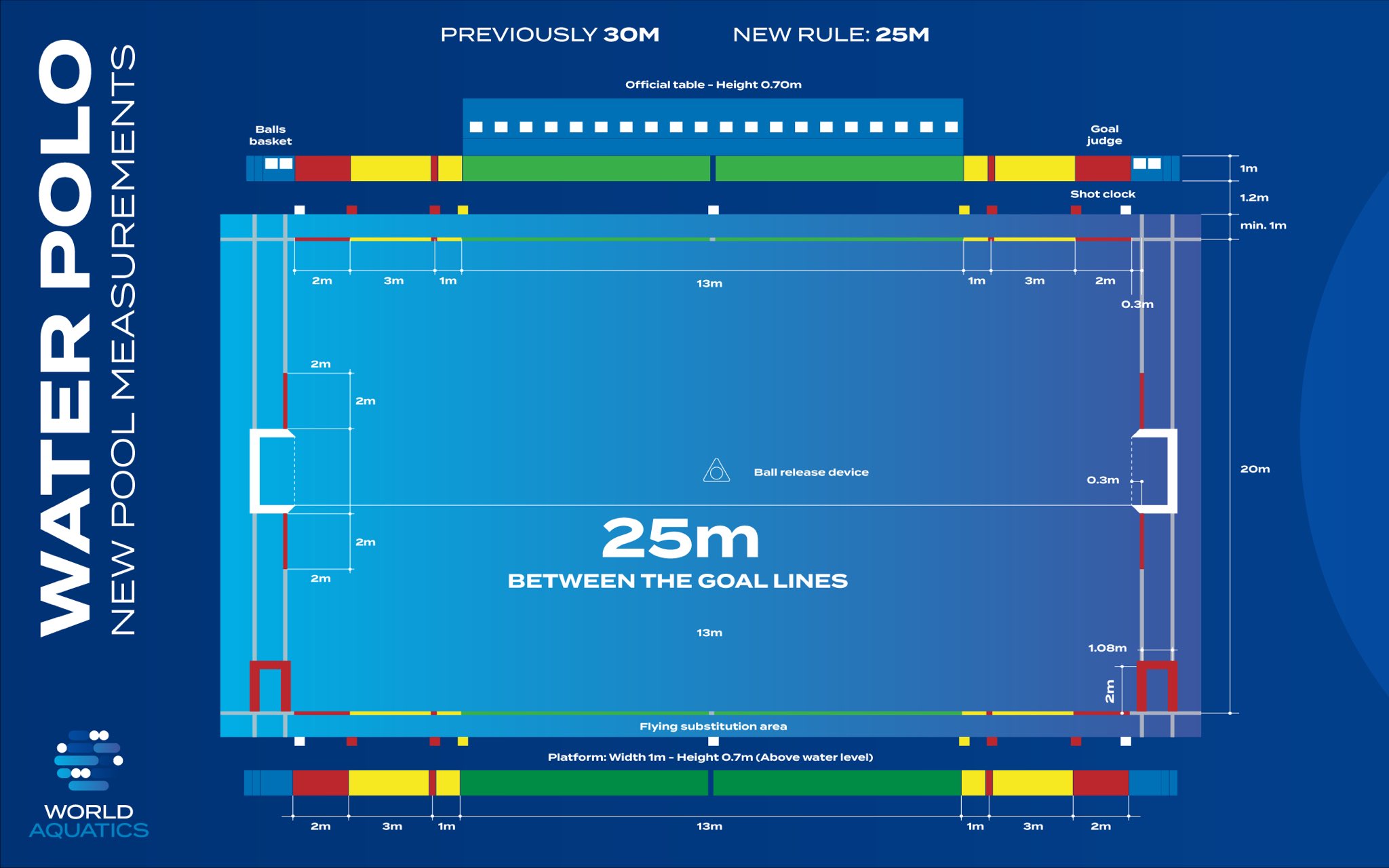 Fra midten af 2025 har World Aquatics indført nye regler, som gælder for internationale kampe i vandpolo. De væsentligste ændringer fremgår nedenfor: